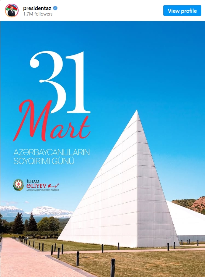 Azərbaycan Respublikasının Prezidenti İlham Əliyevin sosial şəbəkə hesablarında 31 Mart – Azərbaycanlıların Soyqırımı Günü ilə bağlı paylaşım edilib.