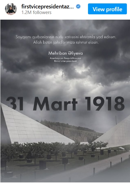 Azərbaycan Respublikasının Birinci vitse-prezidenti Mehriban Əliyeva sosial şəbəkə hesablarında 31 Mart – Azərbaycanlıların Soyqırımı Günü ilə bağlı paylaşım edib.